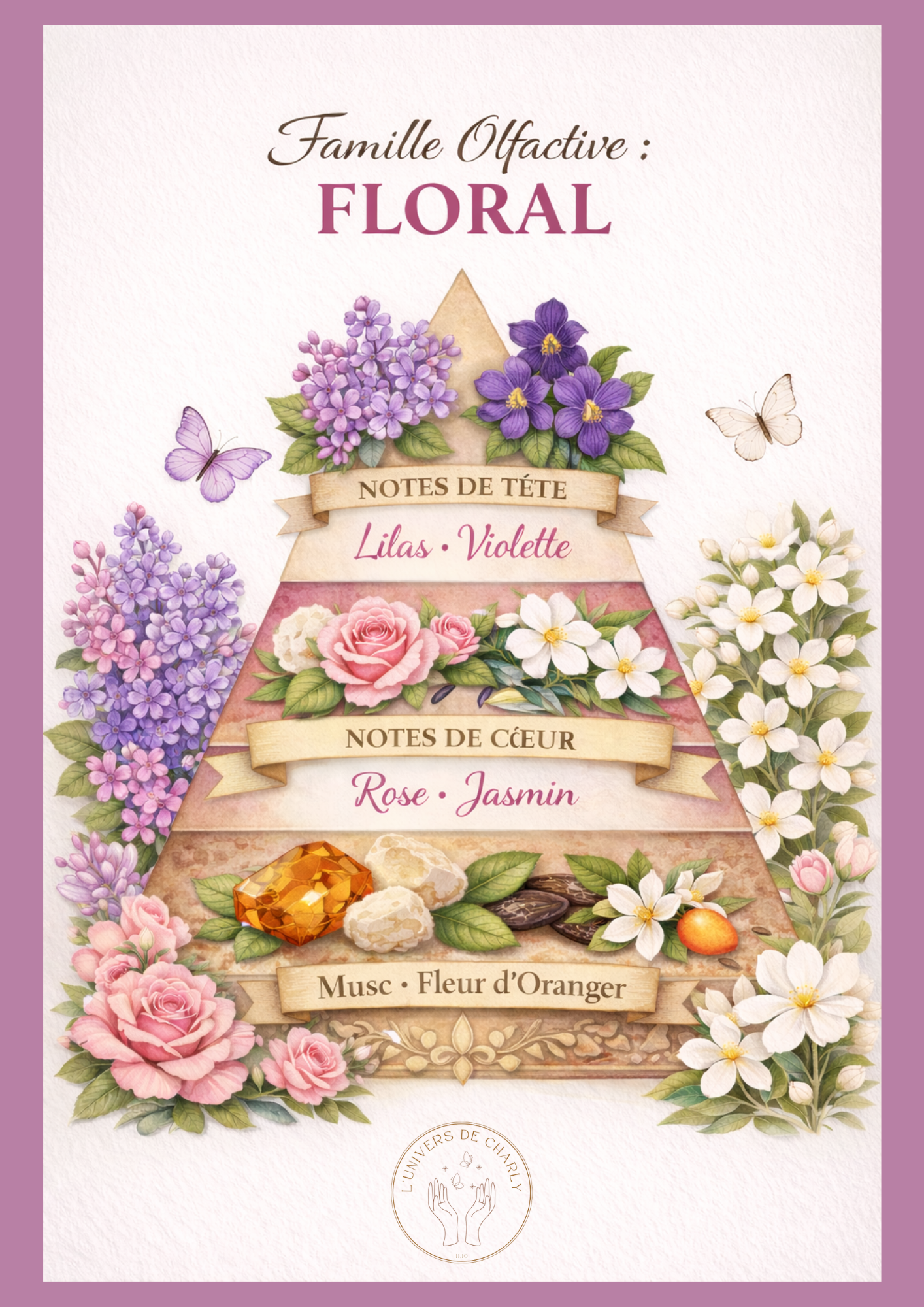 Embarquez pour une promenade fleurie avec cette fragrance délicate. Les notes de lilas et de violette s’ouvrent en douceur, laissant place à un cœur floral de jasmin et de rose. Le tout se fond dans un fond subtil de musc et de fleur d’oranger, créant une ambiance poudrée et réconfortante, comme une brise printanière.