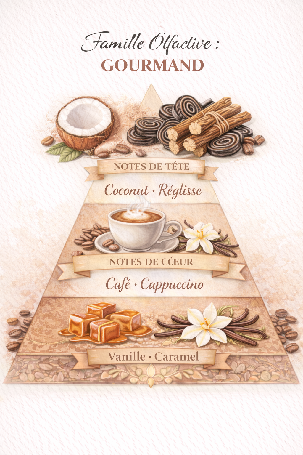 Un voyage olfactif au cœur d'un café italien, cette fragrance gourmande évoque la douceur crémeuse d'un cappuccino frais. Les notes de tête de noix de coco et de réglisse s'ouvrent sur un cœur de café profond, adouci par une base sucrée de vanille et de caramel.