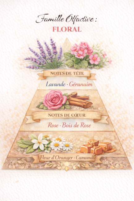 Offrez-vous un moment de détente absolue avec cette fragrance apaisante. Les notes de tête marient la lavande relaxante et le géranium harmonisant, créant une ambiance propice à la détente. Le cœur floral et boisé, associant la rose délicate au bois de rose apaisant, invite à un moment de pause bien mérité. En fond, la fleur d'oranger et la camomille se révèlent, offrant une sensation de bien-être et de sérénité.
