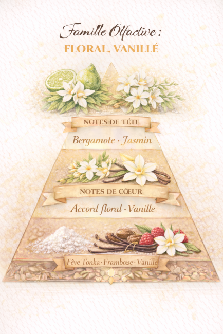 En fond, la fève tonka chaleureuse, la framboise douce et la vanille onctueuse apportent une sensation de réconfort absolu.
